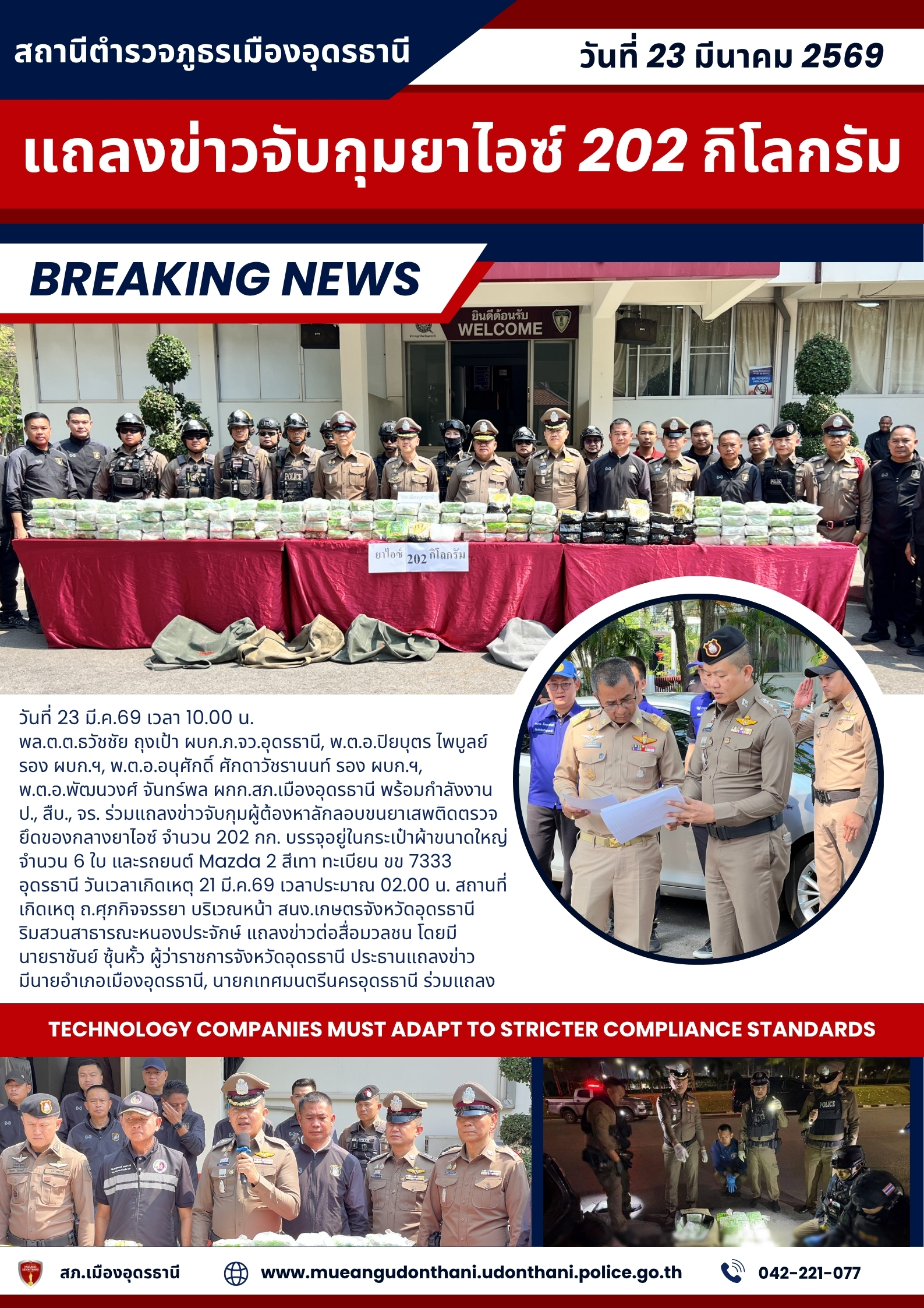 ร่วมแถลงข่าวจับกุมผู้ต้องหาลักลอบขนยาเสพติดตรวจยึดของกลางยาไอซ์ จำนวน 202 กก. 23 มีนาคม 2569 🚨 สภ.เมืองอุดรธานี ภ.จว.อุดรธานี 📕 แถลงข่าวจับกุมยาไอซ์ 202 กก. วันที่ 23 มี.ค.69 เวลา 10.00 น. ภายใ อ่านต่อ >