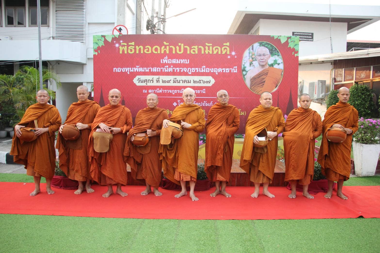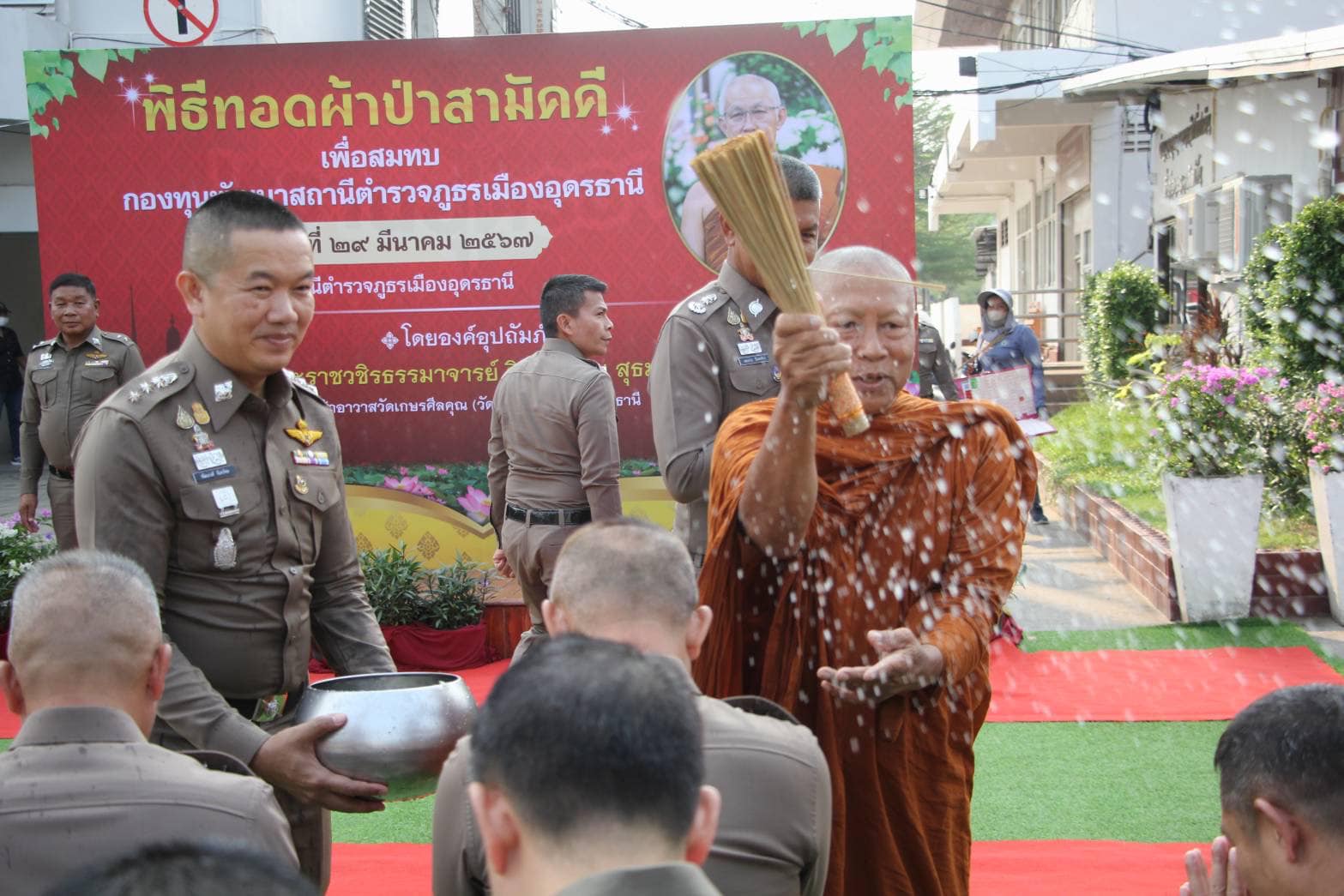 วันที่ 29 มี.ค.67 เวลา 07.00 น. พระราชวิชิรธรรมาจารย์ วิ. (สุธรรม สุธมฺโม) เจ้าอาวาสวัดเกษรศีลคุณ (วัดป่าบ้านตาด) จ.อุดรธานี เป็นองค์อุปถัมภ์ในพิธีทอดผ้าป่าเพื่อสมทบกองทุนพัฒนาสถานีตำรวจภูธรเมืองอุดรธานี โดยมี พล.ต.ต.สรรธาน อินทรจักร์ ผบก.ภ.จว.อุดรธานี, พ.ต.อ.พัฒนวงศ์ จันทร์พล ผกก.สภ.เมืองอุดรธานี พร้อมภรรยา และคณะกรรมการ กต.ตร.ฯ โดย นายวิวรรธน์ ธนากิจพุฒิพงศ์ ร่วมเป็นประธาน พิธีทำบุญตักบาตร และทอดผ้าป่าสามัคคี เพื่อสมทบกองทุนพัฒนาสถานีตำรวจภูธรเมืองอุดรธานี และมีอดีตผู้บังคับบัญชา ข้าราชการชั้นผู้ใหญ่ หัวหน้าสถานีในสังกัด เจ้าหน้าที่ตำรวจ คณะแม่บ้านตำรวจ พ่อค้าประชาชน ร่วมงานบุญทอดผ้าป่าฯ ณ บริเวณหน้าอาคารที่ทำการ สภ.เมืองอุดรธานี