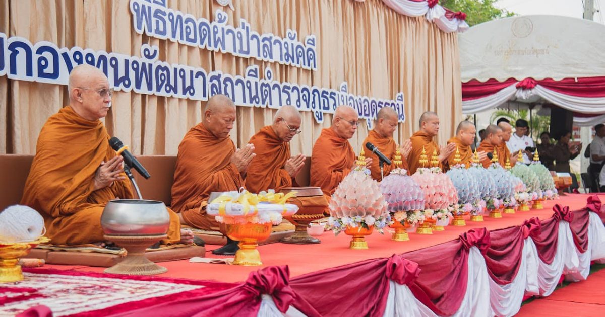 วันที่ 29 มี.ค.67 เวลา 07.00 น. พระราชวิชิรธรรมาจารย์ วิ. (สุธรรม สุธมฺโม) เจ้าอาวาสวัดเกษรศีลคุณ (วัดป่าบ้านตาด) จ.อุดรธานี เป็นองค์อุปถัมภ์ในพิธีทอดผ้าป่าเพื่อสมทบกองทุนพัฒนาสถานีตำรวจภูธรเมืองอุดรธานี โดยมี พล.ต.ต.สรรธาน อินทรจักร์ ผบก.ภ.จว.อุดรธานี, พ.ต.อ.พัฒนวงศ์ จันทร์พล ผกก.สภ.เมืองอุดรธานี พร้อมภรรยา และคณะกรรมการ กต.ตร.ฯ โดย นายวิวรรธน์ ธนากิจพุฒิพงศ์ ร่วมเป็นประธาน พิธีทำบุญตักบาตร และทอดผ้าป่าสามัคคี เพื่อสมทบกองทุนพัฒนาสถานีตำรวจภูธรเมืองอุดรธานี และมีอดีตผู้บังคับบัญชา ข้าราชการชั้นผู้ใหญ่ หัวหน้าสถานีในสังกัด เจ้าหน้าที่ตำรวจ คณะแม่บ้านตำรวจ พ่อค้าประชาชน ร่วมงานบุญทอดผ้าป่าฯ ณ บริเวณหน้าอาคารที่ทำการ สภ.เมืองอุดรธานี