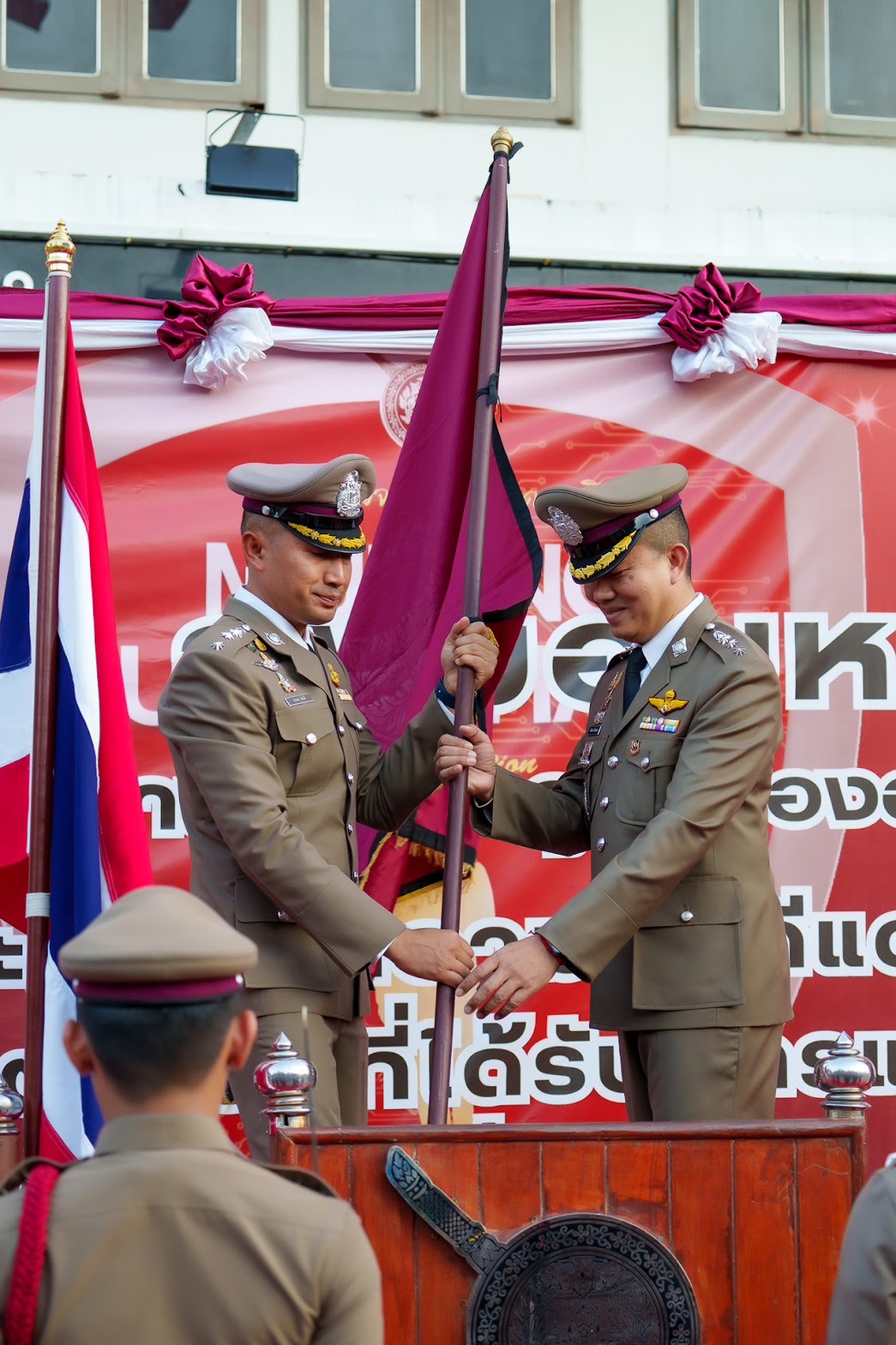 พันตำรวจเอก จามร อันดี รองผู้บังคับการตำรวจภูธรจังหวัดหนองคาย ได้ส่งมอบธงพิทักษ์สันติราษฎร์ และบันทึกการส่งมอบหน้าที่ราชการ แก่