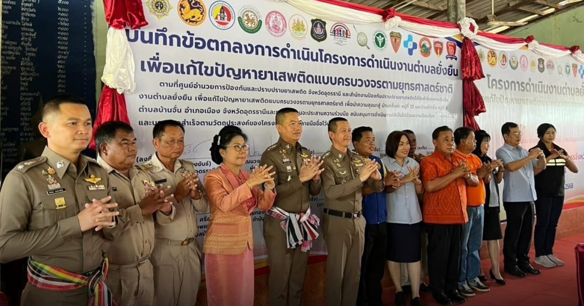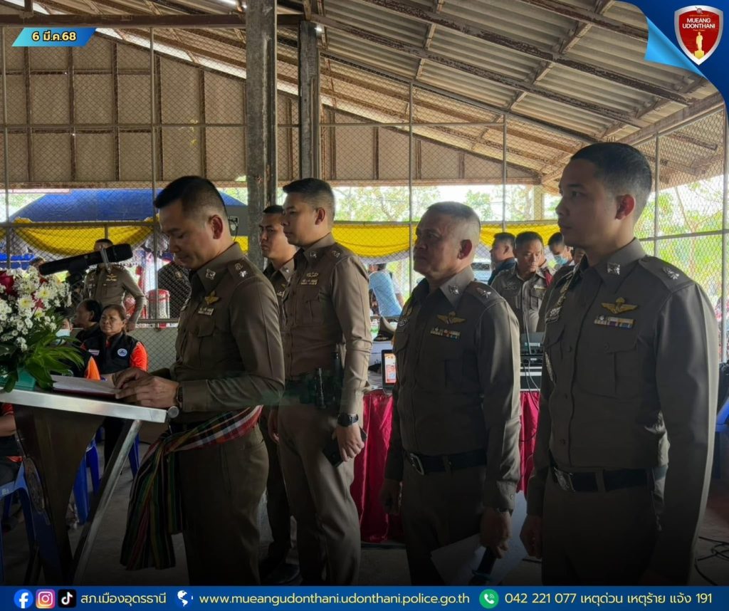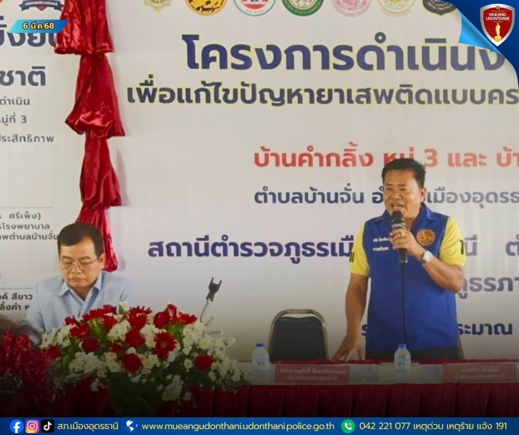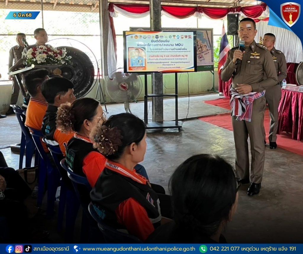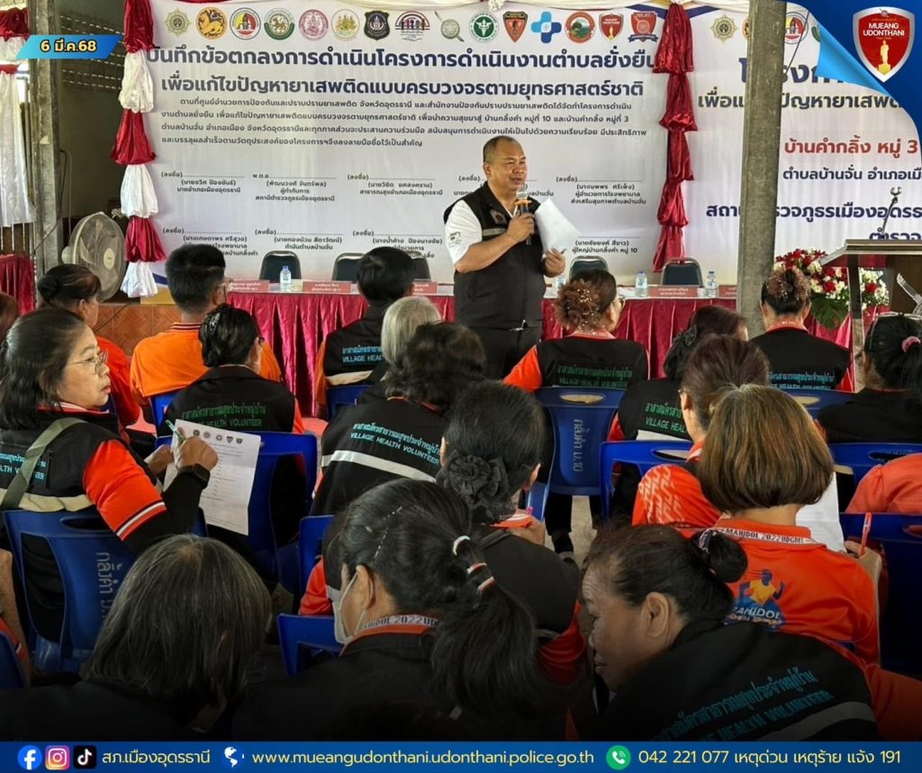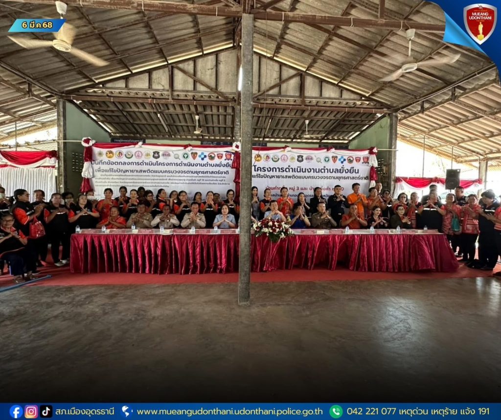 เมื่อวันที่ 13 มี.ค.68 เวลา 10.00 น. พ.ต.อ.อนุศักดิ์ ศักดาวัชรานนท์ รอง ผบก.ภ.จว.อุดรธานี เป็นประธานในพิธีเปิดโครงการดำเนินงานตำบลยั่งยืนเพื่อแก้ไขปัญหายาเสพติดในพื้นที่ตำบลบ้านจั่น โดยมุ่งเน้นการทำงานเชิงรุกในการแก้ไขปัยหาอย่างจริงจัง เพื่อสร้างชุมชนให้มีความเข้มแข็งและยั่งยืนต่อไป โดยมี นายชวิศ ป้องขันธ์ นายอำเภอเมืองอุดรธานี , พ.ต.อ.พัฒนวงศ์ จันทร์พล ผกก.สภ.เมืองอุดรธานี, กำนัน,ผู้ใหญ่บ้านคำกลิ้ง, ผู้ใหญ่บ้านกลิ้งคำ, รพ.สต.ตำบลบ้านจั่น, รพ.สต.บ้านกลิ้งคำ, ผอ.โรงเรียนบ้านคำกลิ้ง, ฯลฯ ร่วมบันทึกข้อตกลงการดำเนินตามโครงการในครั้งนี้ด้วย