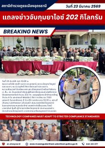 📚 ร่วมแถลงข่าวจับกุมผู้ต้องหาลักลอบขนยาเสพติดตรวจยึดของกลางยาไอซ์ จำนวน 202 กก. บรรจุอยู่ในกระเป๋าผ้าขนาดใหญ่ จำนวน 6 ใบ และรถยนต์ Mazda 2 สีเทา ทะเบียน ขข 7333 อุดรธานี วันเวลาเกิดเหตุ 21 มี.ค.69 เวลาประมาณ 02.00 น. สถานที่เกิดเหตุ ถ.ศุภกิจจรรยา บริเวณหน้า สนง.เกษตรจังหวัดอุดรธานี ริมสวนสาธารณะหนองประจักษ์ แถลงข่าวต่อสื่อมวลชน โดยมี นายราชันย์ ซุ้นหั้ว ผู้ว่าราชการจังหวัดอุดรธานี ประธานแถลงข่าว, นายอำเภอเมืองอุดรธานี, นายกเทศมนตรีนครอุดรธานี ร่วมแถลง