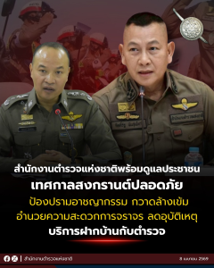 พร้อมกันนี้ ในช่วงเทศกาลสงกรานต์ 2569 สำนักงานตำรวจแห่งชาติได้จัดทำ “โครงการฝากบ้านไว้กับตำรวจ” ระหว่างวันที่ 10 – 20 เมษายน 2569 รวมระยะเวลา 11 วัน เพื่อเสริมการปฏิบัติในการป้องกันอาชญากรรม บริการสำหรับประชาชนที่ต้องออกเดินทางโดยไม่มีใครอยู่ที่บ้านพัก สามารถลงทะเบียนเข้าร่วมโครงการฯ โดยคลิกผ่านแอปพลิเคชัน “Police Care” หรือยื่นแบบฟอร์มเข้าร่วมโครงการฯ ที่สถานีตำรวจใกล้บ้าน