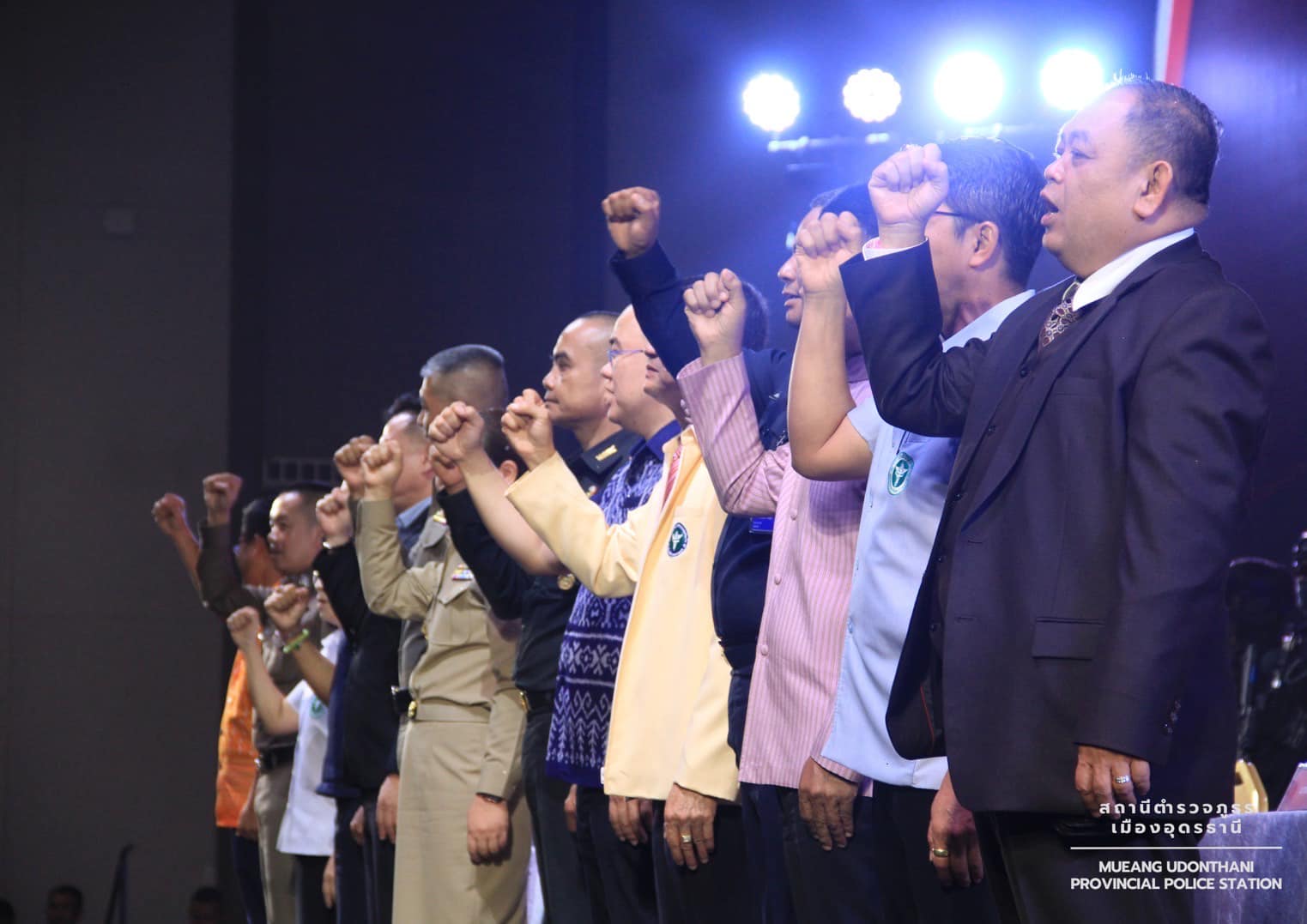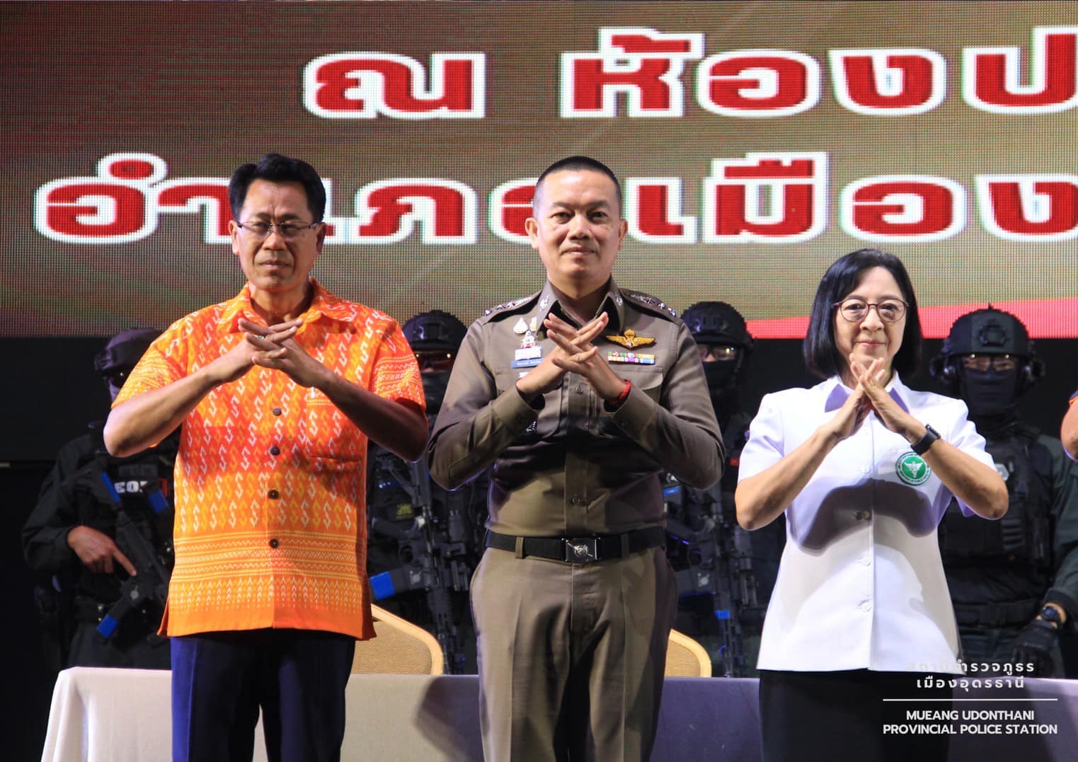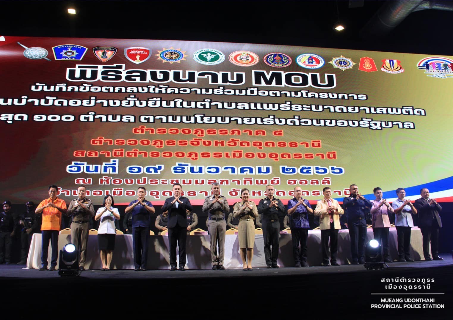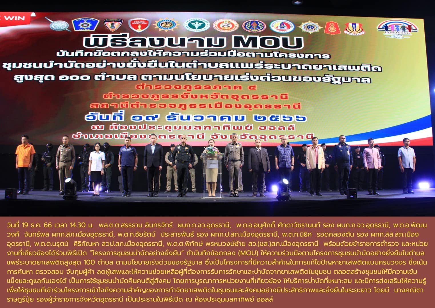 สวป.สภ.เมืองอุดรธานี, พ.ต.ต.พิทักษ์ พรหมวงษ์ซ้าย สว.(ชส.)สภ.เมืองอุดรธานี พร้อมด้วยข้าราชการตำรวจ และหน่วยงานที่เกี่ยวข้องได้ร่วมพิธีเปิด “โครงการชุมชนบำบัดอย่างยั่งยืน” ทำบันทึกข้อตกลง (MOU) ให้ความร่วมมือตามโครงการชุมชนบำบัดอย่างยั่งยืนในตำบลแพร่ระบาดยาเสพติดสูงสุด 100 ตำบล ตามนโยบายเร่งด่วนของรัฐบาล ซึ่งเป็นโครงการที่มีความสำคัญในการแก้ไขปัญหายาเสพติดแบบครบวงจร ซึ่งเน้นการค้นหา ตรวจสอบ จับกุมผู้ค้า ลดผู้เสพและให้ความช่วยเหลือผู้ที่ต้องการรับการรักษาและบำบัดจากยาเสพติดในชุมชน ตลอดสร้างชุมชนให้มีความเข้มแข็งและดูแลกันเองได้ เป็นการใช้ชุมชนบำบัดคืนคนดีสู่สังคม โดยการบูรณาการหน่วยงานที่เกี่ยวข้อง ให้บริการบำบัดที่เหมาะสม และมีการส่งเสริมให้ความรู้ เพื่อให้ชุมชนที่เข้าร่วมโครงการเข้าใจถึงความสำคัญของการกำจัดยาเสพติดในชุมชนและสังคมอย่างมีประสิทธิภาพและยั่งยืนในระยะยาว โดยมี นางคณิตา ราษฎร์นุ้ย รองผู้ว่าราชการจังหวัดอุดรธานี เป็นประธานในพิธีเปิด ณ ห้องประชุมมลฑาทิพย์ ฮอลล์