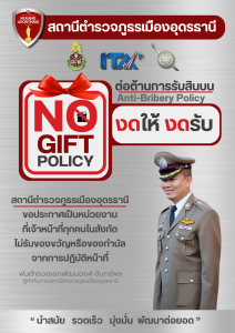 สภ.เมืองอุดรธานี โดย พ.ต.อ.พัฒนวงศ์ จันทร์พล ผกก.สภ.เมืองอุดรธานี ขอประกาศนโยบาย No Gift Policy “งดให้ งดรับ” สินบน ของขวัญ ของกำนัล หรือสินน้ำใจ จากการปฏิบัติหน้าที่ เพื่อเสริมสร้างวัฒนธรรมการทำงานอย่างโปร่งใส