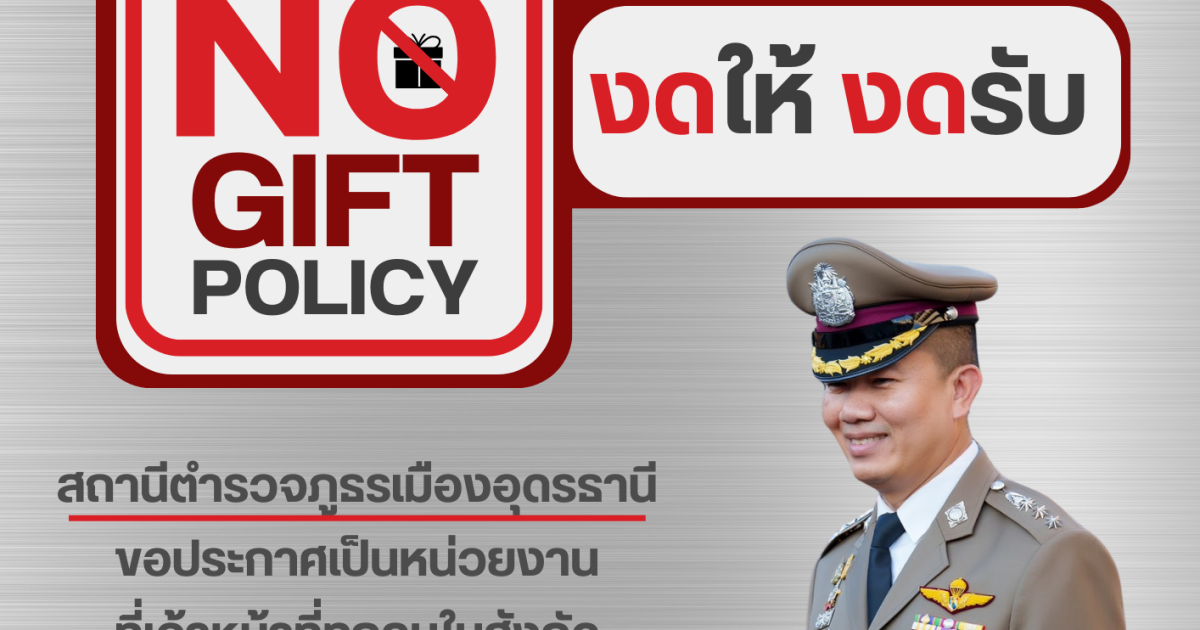 สภ.เมืองอุดรธานี โดย พ.ต.อ.พัฒนวงศ์ จันทร์พล ผกก.สภ.เมืองอุดรธานี ขอประกาศนโยบาย No Gift Policy “งดให้ งดรับ” สินบน ของขวัญ ของกำนัล หรือสินน้ำใจ จากการปฏิบัติหน้าที่ เพื่อเสริมสร้างวัฒนธรรมการทำงานอย่างโปร่งใส