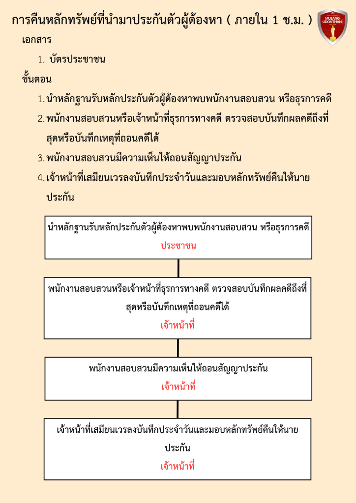 การคืนหลักทรัพย์ที่นำมาประกันตัวผู้ต้องหา ( ภายใน 1 ช.ม. )
