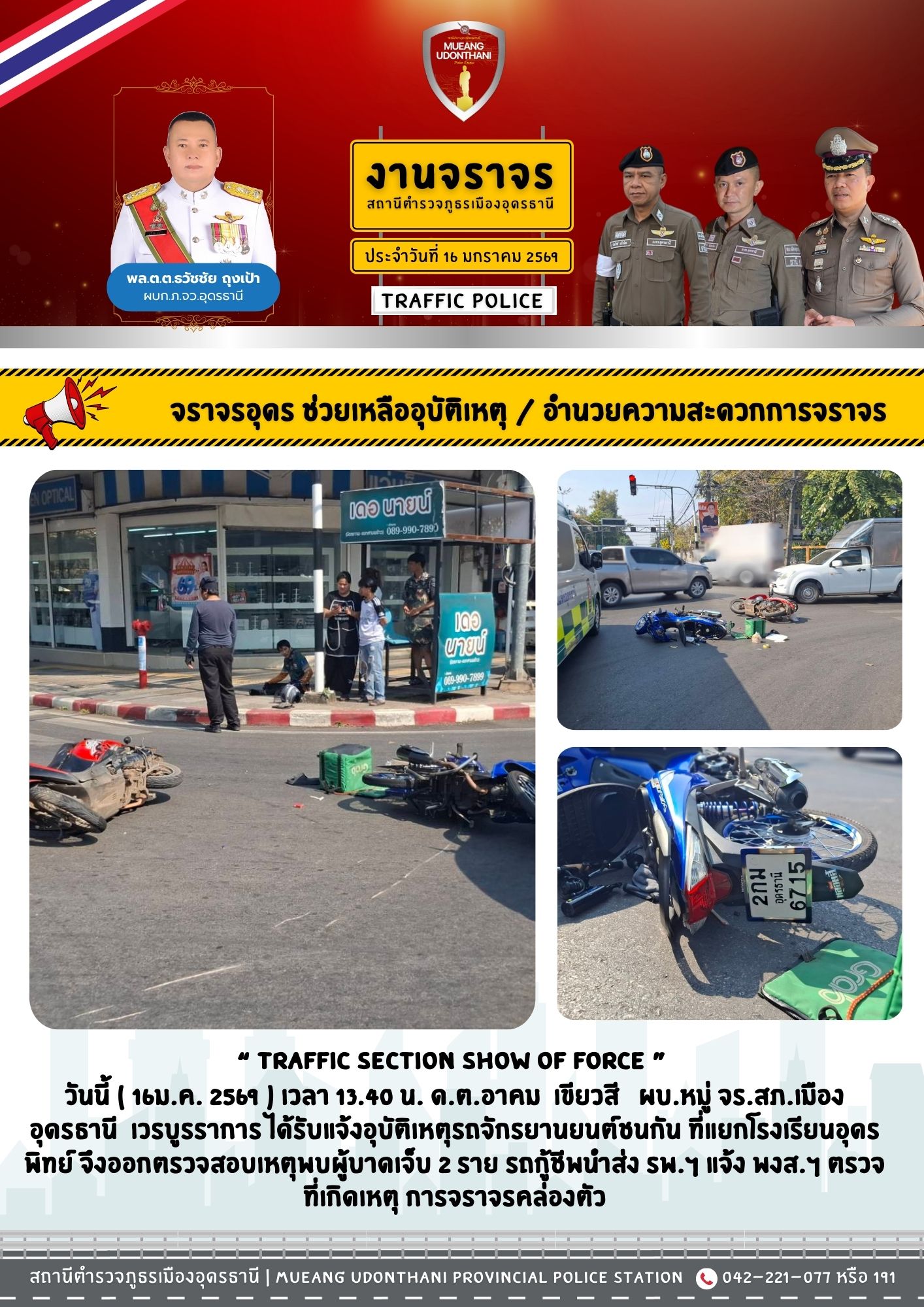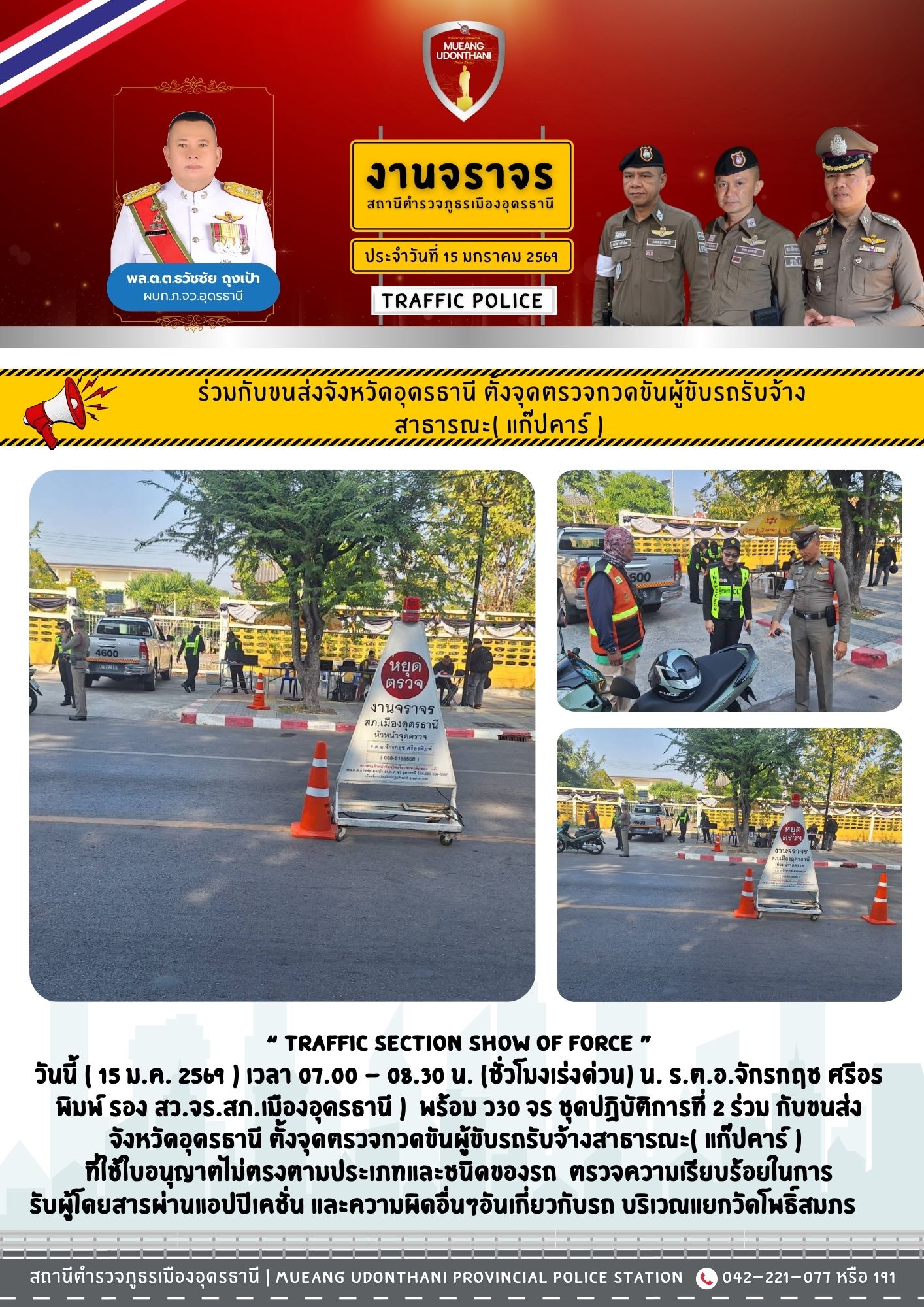 โดยการอำนวยการของ พ.ต.อ.พัฒนวงศ์ จันทร์พล ผกก.สภ.เมืองอุดรธานี พ.ต.ท.ชัยณรงค์ ขันทะสีมา รอง ผกก.จร.ส