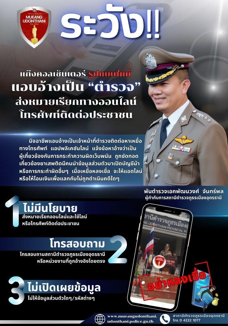 สภ.เมืองอุดรธานี แจ้งเตือนภัย!! มิจฉาชีพ มิจฉาชีพแอบอ้างเป็นเจ้าหน้าที่ตำรวจ เพื่อหลอกลวงประชาชน โดย