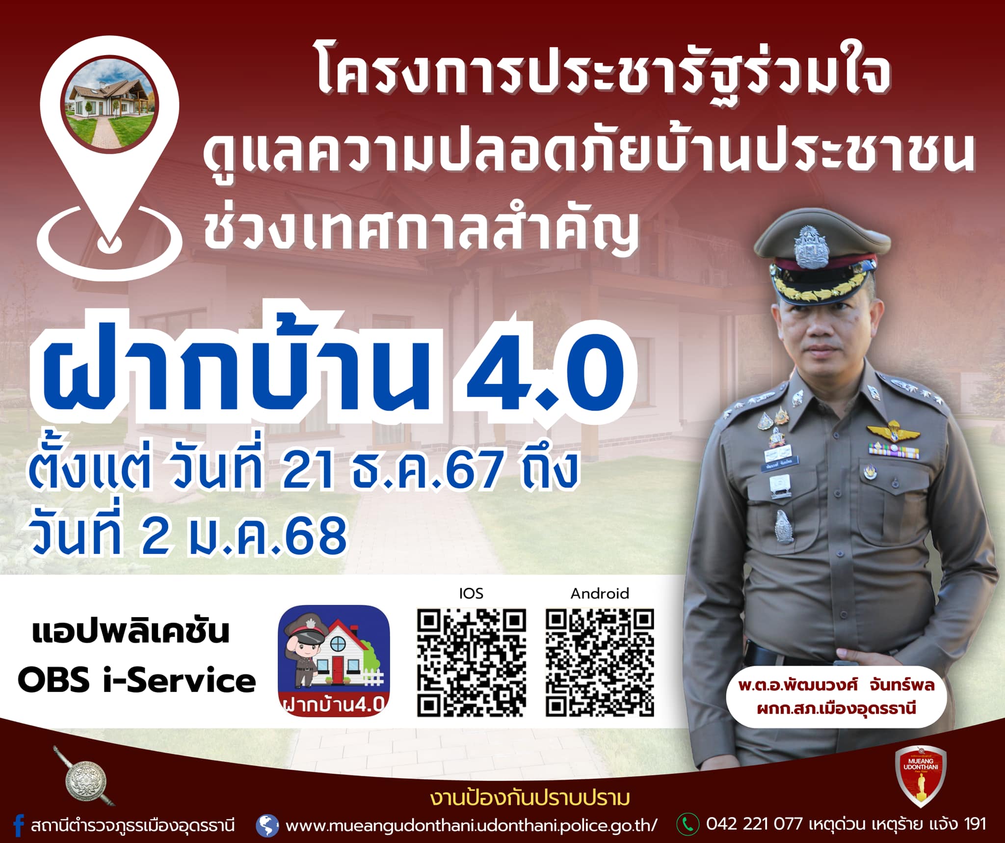 ประชาสัมพันธ์ “ฝากบ้านไว้กับตำรวจ”สภ.เมืองอุดรธานีพ.ต.อ.พัฒนวงศ์ จันทร์พลผกก.สภ.เมืองอุดรธานีพ.ต.ท.ช