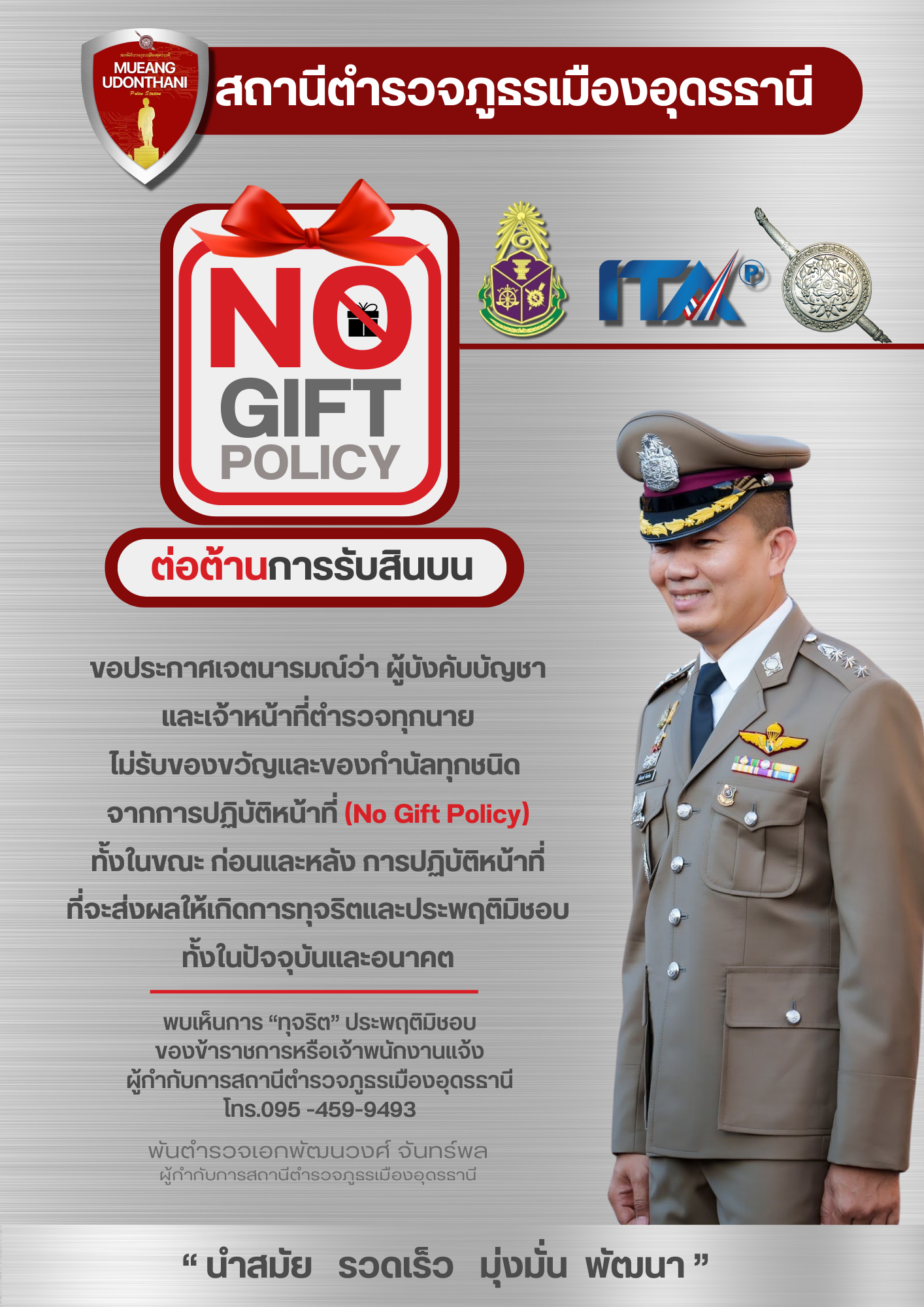 ประกาศนโยบาย No Gift Policy “งดให้ งดรับ” สินบน ของขวัญ ของกำนัล หรือสินน้ำใจ จากการปฏิบัติหน้าที่ เพื่อเสริมสร้างวัฒนธรรมการทำงานอย่างโปร่งใส
